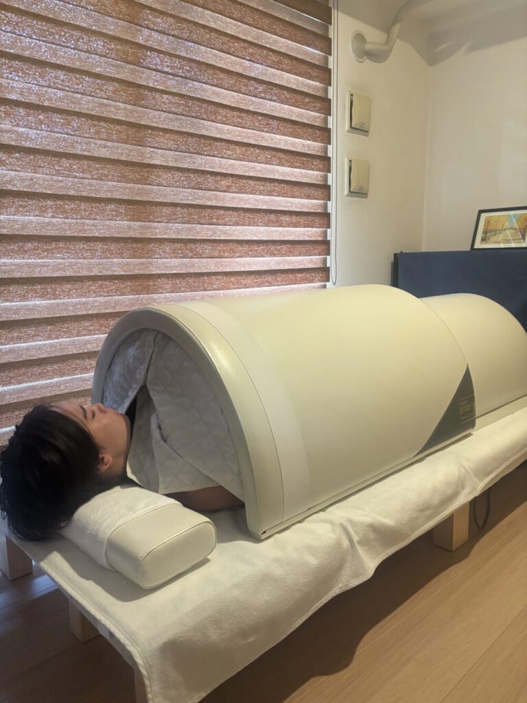 遠赤外線のエネルギーにより、発汗が促されリフレッシュします。お顔が出ているので体が温まる前に苦しくなることがなく、ストレスがありません。気持ちが良ければ眠ってもOKです。