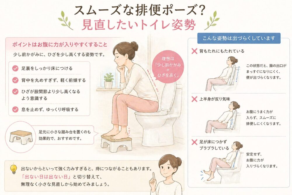 実は、少し体勢を変えるだけで力みに頼らずスムーズに排便しやすくなったりします。